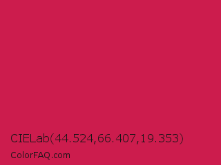CIELab 44.524,66.407,19.353 Color is a normal rose color and the nearest color is Maroon Flush #c32148. Hex code #cc1c4d and RGB value is rgb(204,28,77). In RGB color space, this color is composed of 80% red, 11% green, 30% blue, In CMYK color space, this color is composed of 0% cyan, 86% magenta, 62% yellow , 20% black , In HSL color space, this color has a hue angle of 343° , 76% saturation and 45% lightness.