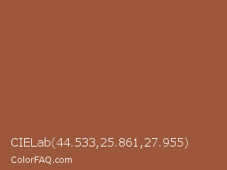 CIELab 44.533,25.861,27.955 Color is a normal orange color and the nearest color is Sepia Skin #9e5b40. Hex code #9c573c and RGB value is rgb(156,87,60). In RGB color space, this color is composed of 61% red, 34% green, 24% blue, In CMYK color space, this color is composed of 0% cyan, 44% magenta, 62% yellow , 39% black , In HSL color space, this color has a hue angle of 17° , 44% saturation and 42% lightness.