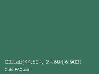 CIELab 44.534,-24.684,6.983 Color is a normal green color and the nearest color is Amazon #3b7a57. Hex code #3b745d and RGB value is rgb(59,116,93). In RGB color space, this color is composed of 23% red, 45% green, 36% blue, In CMYK color space, this color is composed of 49% cyan, 0% magenta, 20% yellow , 55% black , In HSL color space, this color has a hue angle of 156° , 33% saturation and 34% lightness.
