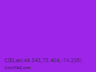 CIELab 44.543,75.404,-74.235 Color is a normal purple color and the nearest color is Veronica #a020f0. Hex code #9c25e8 and RGB value is rgb(156,37,232). In RGB color space, this color is composed of 61% red, 15% green, 91% blue, In CMYK color space, this color is composed of 33% cyan, 84% magenta, 0% yellow , 9% black , In HSL color space, this color has a hue angle of 277° , 81% saturation and 53% lightness.