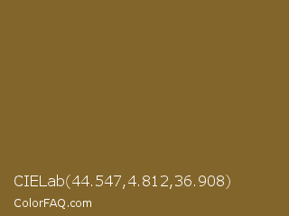 CIELab 44.547,4.812,36.908 Color is a normal orange color and the nearest color is Kumera #886221. Hex code #82652a and RGB value is rgb(130,101,42). In RGB color space, this color is composed of 51% red, 40% green, 16% blue, In CMYK color space, this color is composed of 0% cyan, 22% magenta, 68% yellow , 49% black , In HSL color space, this color has a hue angle of 40° , 51% saturation and 34% lightness.