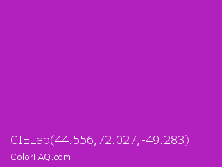 CIELab 44.556,72.027,-49.283 Color is a normal magenta color and the nearest color is Byzantine #bd33a4. Hex code #b221bd and RGB value is rgb(178,33,189). In RGB color space, this color is composed of 70% red, 13% green, 74% blue, In CMYK color space, this color is composed of 6% cyan, 83% magenta, 0% yellow , 26% black , In HSL color space, this color has a hue angle of 296° , 70% saturation and 44% lightness.