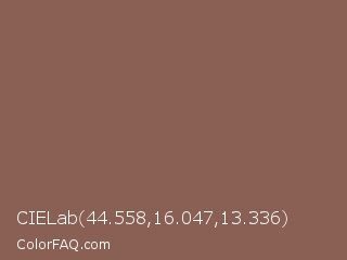 CIELab 44.558,16.047,13.336 Color is a normal red color and the nearest color is Spicy Mix #8b5f4d. Hex code #8a5f54 and RGB value is rgb(138,95,84). In RGB color space, this color is composed of 54% red, 37% green, 33% blue, In CMYK color space, this color is composed of 0% cyan, 31% magenta, 39% yellow , 46% black , In HSL color space, this color has a hue angle of 12° , 24% saturation and 44% lightness.