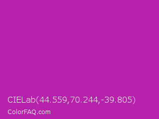 CIELab 44.559,70.244,-39.805 Color is a normal magenta color and the nearest color is Byzantine #bd33a4. Hex code #b722ad and RGB value is rgb(183,34,173). In RGB color space, this color is composed of 72% red, 13% green, 68% blue, In CMYK color space, this color is composed of 0% cyan, 81% magenta, 5% yellow , 28% black , In HSL color space, this color has a hue angle of 304° , 69% saturation and 43% lightness.