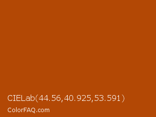 CIELab 44.56,40.925,53.591 Color is a normal orange color and the nearest color is Vesuvius #b14a0b. Hex code #b34805 and RGB value is rgb(179,72,5). In RGB color space, this color is composed of 70% red, 28% green, 2% blue, In CMYK color space, this color is composed of 0% cyan, 60% magenta, 97% yellow , 30% black , In HSL color space, this color has a hue angle of 23° , 95% saturation and 36% lightness.