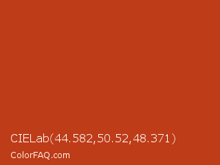 CIELab 44.582,50.52,48.371 Color is a normal red color and the nearest color is Dark Pastel Red #c23b22. Hex code #be3c18 and RGB value is rgb(190,60,24). In RGB color space, this color is composed of 75% red, 24% green, 9% blue, In CMYK color space, this color is composed of 0% cyan, 68% magenta, 87% yellow , 25% black , In HSL color space, this color has a hue angle of 13° , 78% saturation and 42% lightness.