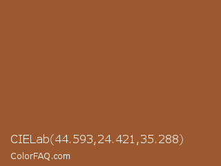 CIELab 44.593,24.421,35.288 Color is a normal orange color and the nearest color is Paarl #a65529. Hex code #9c582f and RGB value is rgb(156,88,47). In RGB color space, this color is composed of 61% red, 35% green, 18% blue, In CMYK color space, this color is composed of 0% cyan, 44% magenta, 70% yellow , 39% black , In HSL color space, this color has a hue angle of 23° , 54% saturation and 40% lightness.