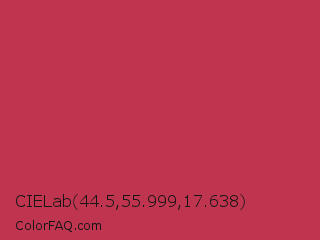 CIELab 44.5,55.999,17.638 Color is a normal red color and the nearest color is Dingy Dungeon #c53151. Hex code #bf354f and RGB value is rgb(191,53,79). In RGB color space, this color is composed of 75% red, 21% green, 31% blue, In CMYK color space, this color is composed of 0% cyan, 72% magenta, 59% yellow , 25% black , In HSL color space, this color has a hue angle of 349° , 57% saturation and 48% lightness.