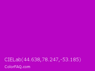 CIELab 44.638,78.247,-53.185 Color is a normal magenta color and the nearest color is Heliotrope Magenta #aa00bb. Hex code #b805c4 and RGB value is rgb(184,5,196). In RGB color space, this color is composed of 72% red, 2% green, 77% blue, In CMYK color space, this color is composed of 6% cyan, 97% magenta, 0% yellow , 23% black , In HSL color space, this color has a hue angle of 296° , 95% saturation and 39% lightness.