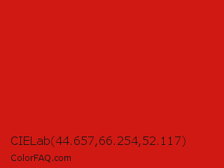 CIELab 44.657,66.254,52.117 Color is a normal red color and the nearest color is Lava #cf1020. Hex code #d11913 and RGB value is rgb(209,25,19). In RGB color space, this color is composed of 82% red, 10% green, 7% blue, In CMYK color space, this color is composed of 0% cyan, 88% magenta, 91% yellow , 18% black , In HSL color space, this color has a hue angle of 2° , 83% saturation and 45% lightness.