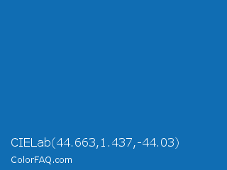 CIELab 44.663,1.437,-44.03 Color is a normal blue color and the nearest color is Green Blue #1164b4. Hex code #106db3 and RGB value is rgb(16,109,179). In RGB color space, this color is composed of 6% red, 43% green, 70% blue, In CMYK color space, this color is composed of 91% cyan, 39% magenta, 0% yellow , 30% black , In HSL color space, this color has a hue angle of 206° , 84% saturation and 38% lightness.