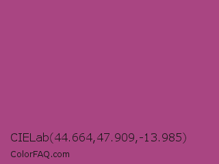 CIELab 44.664,47.909,-13.985 Color is a normal magenta color and the nearest color is Mystic Maroon #ad4379. Hex code #a94582 and RGB value is rgb(169,69,130). In RGB color space, this color is composed of 66% red, 27% green, 51% blue, In CMYK color space, this color is composed of 0% cyan, 59% magenta, 23% yellow , 34% black , In HSL color space, this color has a hue angle of 323° , 42% saturation and 47% lightness.
