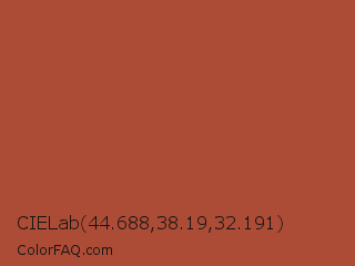 CIELab 44.688,38.19,32.191 Color is a normal red color and the nearest color is Medium Carmine #af4035. Hex code #ad4c36 and RGB value is rgb(173,76,54). In RGB color space, this color is composed of 68% red, 30% green, 21% blue, In CMYK color space, this color is composed of 0% cyan, 56% magenta, 69% yellow , 32% black , In HSL color space, this color has a hue angle of 11° , 52% saturation and 45% lightness.
