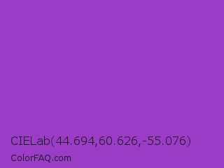 CIELab 44.694,60.626,-55.076 Color is a normal purple color and the nearest color is Dark Orchid #9932cc. Hex code #9b3cc7 and RGB value is rgb(155,60,199). In RGB color space, this color is composed of 61% red, 24% green, 78% blue, In CMYK color space, this color is composed of 22% cyan, 70% magenta, 0% yellow , 22% black , In HSL color space, this color has a hue angle of 281° , 55% saturation and 51% lightness.