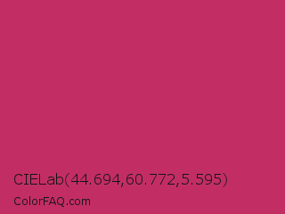 CIELab 44.694,60.772,5.595 Color is a normal rose color and the nearest color is Hibiscus #b6316c. Hex code #c22e63 and RGB value is rgb(194,46,99). In RGB color space, this color is composed of 76% red, 18% green, 39% blue, In CMYK color space, this color is composed of 0% cyan, 76% magenta, 49% yellow , 24% black , In HSL color space, this color has a hue angle of 339° , 62% saturation and 47% lightness.