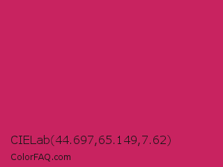 CIELab 44.697,65.149,7.62 Color is a normal rose color and the nearest color is Rose Red #c21e56. Hex code #c82360 and RGB value is rgb(200,35,96). In RGB color space, this color is composed of 78% red, 14% green, 38% blue, In CMYK color space, this color is composed of 0% cyan, 83% magenta, 52% yellow , 22% black , In HSL color space, this color has a hue angle of 338° , 70% saturation and 46% lightness.