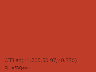 CIELab 44.705,50.97,40.776 Color is a normal red color and the nearest color is Dark Pastel Red #c23b22. Hex code #be3c28 and RGB value is rgb(190,60,40). In RGB color space, this color is composed of 75% red, 24% green, 16% blue, In CMYK color space, this color is composed of 0% cyan, 68% magenta, 79% yellow , 25% black , In HSL color space, this color has a hue angle of 8° , 65% saturation and 45% lightness.