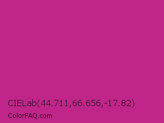 CIELab 44.711,66.656,-17.82 Color is a normal magenta color and the nearest color is Royal Fuchsia #ca2c92. Hex code #c02589 and RGB value is rgb(192,37,137). In RGB color space, this color is composed of 75% red, 15% green, 54% blue, In CMYK color space, this color is composed of 0% cyan, 81% magenta, 29% yellow , 25% black , In HSL color space, this color has a hue angle of 321° , 68% saturation and 45% lightness.