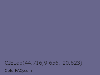 CIELab 44.716,9.656,-20.623 Color is a normal indigo color and the nearest color is Dark Blue Gray #666699. Hex code #68668c and RGB value is rgb(104,102,140). In RGB color space, this color is composed of 41% red, 40% green, 55% blue, In CMYK color space, this color is composed of 26% cyan, 27% magenta, 0% yellow , 45% black , In HSL color space, this color has a hue angle of 243° , 16% saturation and 47% lightness.