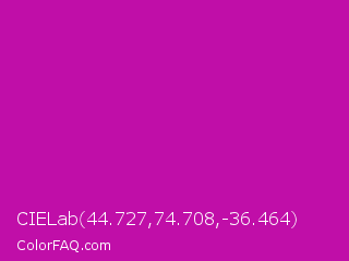 CIELab 44.727,74.708,-36.464 Color is a normal magenta color and the nearest color is Heliotrope Magenta #aa00bb. Hex code #c00ea8 and RGB value is rgb(192,14,168). In RGB color space, this color is composed of 75% red, 5% green, 66% blue, In CMYK color space, this color is composed of 0% cyan, 93% magenta, 13% yellow , 25% black , In HSL color space, this color has a hue angle of 308° , 86% saturation and 40% lightness.