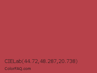 CIELab 44.72,48.287,20.738 Color is a normal red color and the nearest color is Deep Chestnut #b94e48. Hex code #b7414a and RGB value is rgb(183,65,74). In RGB color space, this color is composed of 72% red, 25% green, 29% blue, In CMYK color space, this color is composed of 0% cyan, 64% magenta, 60% yellow , 28% black , In HSL color space, this color has a hue angle of 355° , 48% saturation and 49% lightness.
