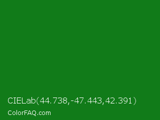 CIELab 44.738,-47.443,42.391 Color is a dark green color and the nearest color is India Green #138808. Hex code #117b19 and RGB value is rgb(17,123,25). In RGB color space, this color is composed of 7% red, 48% green, 10% blue, In CMYK color space, this color is composed of 86% cyan, 0% magenta, 80% yellow , 52% black , In HSL color space, this color has a hue angle of 125° , 76% saturation and 27% lightness.