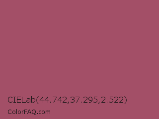 CIELab 44.742,37.295,2.522 Color is a normal rose color and the nearest color is China Rose #a8516e. Hex code #a34f67 and RGB value is rgb(163,79,103). In RGB color space, this color is composed of 64% red, 31% green, 40% blue, In CMYK color space, this color is composed of 0% cyan, 52% magenta, 37% yellow , 36% black , In HSL color space, this color has a hue angle of 343° , 35% saturation and 47% lightness.