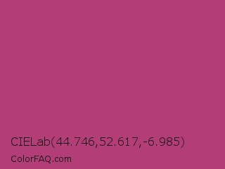 CIELab 44.746,52.617,-6.985 Color is a normal rose color and the nearest color is Mystic Maroon #ad4379. Hex code #b33e77 and RGB value is rgb(179,62,119). In RGB color space, this color is composed of 70% red, 24% green, 47% blue, In CMYK color space, this color is composed of 0% cyan, 65% magenta, 34% yellow , 30% black , In HSL color space, this color has a hue angle of 331° , 49% saturation and 47% lightness.