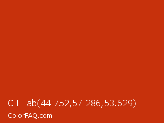 CIELab 44.752,57.286,53.629 Color is a normal red color and the nearest color is Thunderbird #c02b18. Hex code #c7310c and RGB value is rgb(199,49,12). In RGB color space, this color is composed of 78% red, 19% green, 5% blue, In CMYK color space, this color is composed of 0% cyan, 75% magenta, 94% yellow , 22% black , In HSL color space, this color has a hue angle of 12° , 89% saturation and 41% lightness.