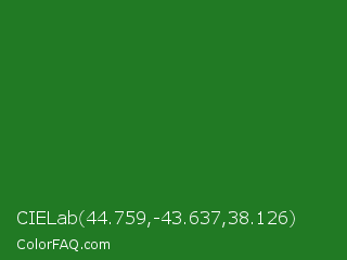 CIELab 44.759,-43.637,38.126 Color is a dark green color and the nearest color is Forest Green #228b22. Hex code #217a24 and RGB value is rgb(33,122,36). In RGB color space, this color is composed of 13% red, 48% green, 14% blue, In CMYK color space, this color is composed of 73% cyan, 0% magenta, 70% yellow , 52% black , In HSL color space, this color has a hue angle of 122° , 57% saturation and 30% lightness.
