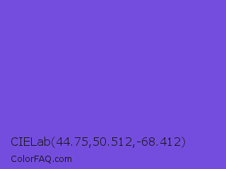 CIELab 44.75,50.512,-68.412 Color is a normal indigo color and the nearest color is Majorelle Blue #6050dc. Hex code #754dde and RGB value is rgb(117,77,222). In RGB color space, this color is composed of 46% red, 30% green, 87% blue, In CMYK color space, this color is composed of 47% cyan, 65% magenta, 0% yellow , 13% black , In HSL color space, this color has a hue angle of 257° , 69% saturation and 59% lightness.