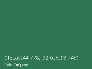 CIELab 44.778,-32.016,13.745 Color is a normal green color and the nearest color is Amazon #3b7a57. Hex code #2e7752 and RGB value is rgb(46,119,82). In RGB color space, this color is composed of 18% red, 47% green, 32% blue, In CMYK color space, this color is composed of 61% cyan, 0% magenta, 31% yellow , 53% black , In HSL color space, this color has a hue angle of 150° , 44% saturation and 32% lightness.