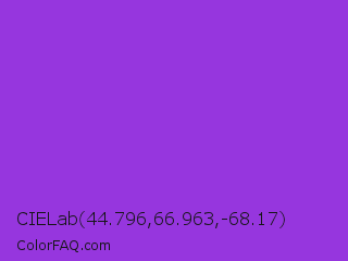CIELab 44.796,66.963,-68.17 Color is a normal purple color and the nearest color is Blue Violet #8a2be2. Hex code #9636de and RGB value is rgb(150,54,222). In RGB color space, this color is composed of 59% red, 21% green, 87% blue, In CMYK color space, this color is composed of 32% cyan, 76% magenta, 0% yellow , 13% black , In HSL color space, this color has a hue angle of 274° , 72% saturation and 54% lightness.