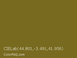 CIELab 44.801,-3.491,41.956 Color is a dark yellow color and the nearest color is Olivetone #716e10. Hex code #786a1f and RGB value is rgb(120,106,31). In RGB color space, this color is composed of 47% red, 42% green, 12% blue, In CMYK color space, this color is composed of 0% cyan, 12% magenta, 74% yellow , 53% black , In HSL color space, this color has a hue angle of 51° , 59% saturation and 30% lightness.