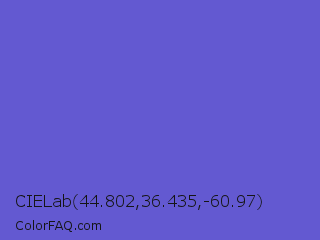 CIELab 44.802,36.435,-60.97 Color is a normal indigo color and the nearest color is Slate Blue #6a5acd. Hex code #6359d1 and RGB value is rgb(99,89,209). In RGB color space, this color is composed of 39% red, 35% green, 82% blue, In CMYK color space, this color is composed of 53% cyan, 57% magenta, 0% yellow , 18% black , In HSL color space, this color has a hue angle of 245° , 57% saturation and 58% lightness.