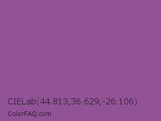 CIELab 44.813,36.629,-26.106 Color is a normal magenta color and the nearest color is Trendy Pink #8c6495. Hex code #915396 and RGB value is rgb(145,83,150). In RGB color space, this color is composed of 57% red, 33% green, 59% blue, In CMYK color space, this color is composed of 3% cyan, 45% magenta, 0% yellow , 41% black , In HSL color space, this color has a hue angle of 296° , 29% saturation and 46% lightness.