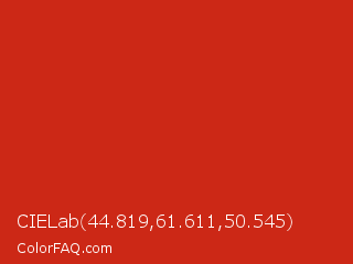 CIELab 44.819,61.611,50.545 Color is a normal red color and the nearest color is Thunderbird #c02b18. Hex code #cc2816 and RGB value is rgb(204,40,22). In RGB color space, this color is composed of 80% red, 16% green, 9% blue, In CMYK color space, this color is composed of 0% cyan, 80% magenta, 89% yellow , 20% black , In HSL color space, this color has a hue angle of 6° , 81% saturation and 44% lightness.