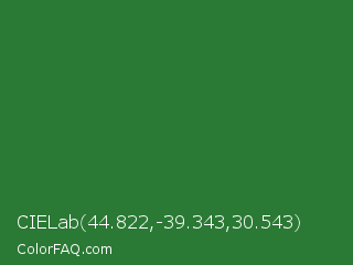 CIELab 44.822,-39.343,30.543 Color is a normal green color and the nearest color is Mughal Green #306030. Hex code #2a7934 and RGB value is rgb(42,121,52). In RGB color space, this color is composed of 16% red, 47% green, 20% blue, In CMYK color space, this color is composed of 65% cyan, 0% magenta, 57% yellow , 53% black , In HSL color space, this color has a hue angle of 128° , 48% saturation and 32% lightness.
