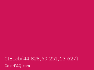 CIELab 44.828,69.251,13.627 Color is a normal rose color and the nearest color is Debian Red #d70a53. Hex code #cf1357 and RGB value is rgb(207,19,87). In RGB color space, this color is composed of 81% red, 7% green, 34% blue, In CMYK color space, this color is composed of 0% cyan, 91% magenta, 58% yellow , 19% black , In HSL color space, this color has a hue angle of 338° , 83% saturation and 44% lightness.