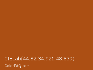 CIELab 44.82,34.921,48.839 Color is a normal orange color and the nearest color is Fiery Orange #b35213. Hex code #ac4f14 and RGB value is rgb(172,79,20). In RGB color space, this color is composed of 67% red, 31% green, 8% blue, In CMYK color space, this color is composed of 0% cyan, 54% magenta, 88% yellow , 33% black , In HSL color space, this color has a hue angle of 23° , 79% saturation and 38% lightness.