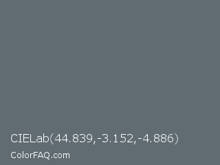 CIELab 44.839,-3.152,-4.886 Color is a normal blue color and the nearest color is Nevada #646e75. Hex code #606c72 and RGB value is rgb(96,108,114). In RGB color space, this color is composed of 38% red, 42% green, 45% blue, In CMYK color space, this color is composed of 16% cyan, 5% magenta, 0% yellow , 55% black , In HSL color space, this color has a hue angle of 200° , 9% saturation and 41% lightness.