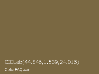 CIELab 44.846,1.539,24.015 Color is a normal orange color and the nearest color is Raw Umber #826644. Hex code #7a6842 and RGB value is rgb(122,104,66). In RGB color space, this color is composed of 48% red, 41% green, 26% blue, In CMYK color space, this color is composed of 0% cyan, 15% magenta, 46% yellow , 52% black , In HSL color space, this color has a hue angle of 41° , 30% saturation and 37% lightness.