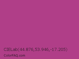 CIELab 44.876,53.946,-17.205 Color is a normal magenta color and the nearest color is Fandango #b53389. Hex code #b03e88 and RGB value is rgb(176,62,136). In RGB color space, this color is composed of 69% red, 24% green, 53% blue, In CMYK color space, this color is composed of 0% cyan, 65% magenta, 23% yellow , 31% black , In HSL color space, this color has a hue angle of 321° , 48% saturation and 47% lightness.