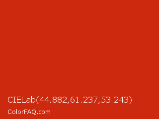 CIELab 44.882,61.237,53.243 Color is a normal red color and the nearest color is Thunderbird #c02b18. Hex code #cc290f and RGB value is rgb(204,41,15). In RGB color space, this color is composed of 80% red, 16% green, 6% blue, In CMYK color space, this color is composed of 0% cyan, 80% magenta, 93% yellow , 20% black , In HSL color space, this color has a hue angle of 8° , 86% saturation and 43% lightness.