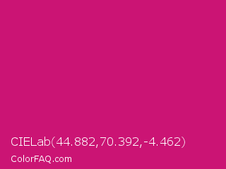 CIELab 44.882,70.392,-4.462 Color is a normal rose color and the nearest color is Magenta Dye #ca1f7b. Hex code #cb1474 and RGB value is rgb(203,20,116). In RGB color space, this color is composed of 80% red, 8% green, 45% blue, In CMYK color space, this color is composed of 0% cyan, 90% magenta, 43% yellow , 20% black , In HSL color space, this color has a hue angle of 329° , 82% saturation and 44% lightness.
