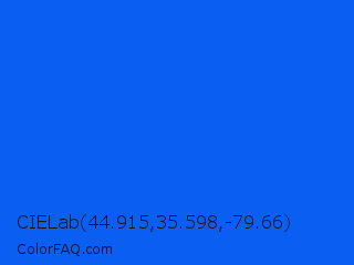 CIELab 44.915,35.598,-79.66 Color is a normal blue color and the nearest color is Blue Ribbon #0066ff. Hex code #0a5ef2 and RGB value is rgb(10,94,242). In RGB color space, this color is composed of 4% red, 37% green, 95% blue, In CMYK color space, this color is composed of 96% cyan, 61% magenta, 0% yellow , 5% black , In HSL color space, this color has a hue angle of 218° , 92% saturation and 49% lightness.