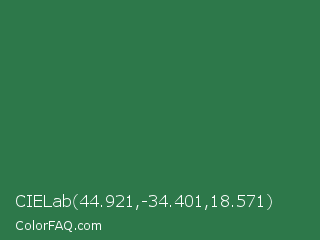 CIELab 44.921,-34.401,18.571 Color is a normal green color and the nearest color is Goblin #3d7d52. Hex code #2d784a and RGB value is rgb(45,120,74). In RGB color space, this color is composed of 18% red, 47% green, 29% blue, In CMYK color space, this color is composed of 63% cyan, 0% magenta, 38% yellow , 53% black , In HSL color space, this color has a hue angle of 143° , 45% saturation and 32% lightness.
