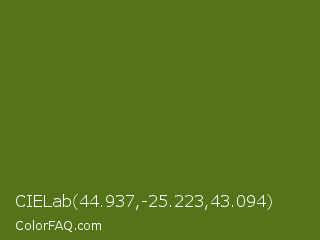 CIELab 44.937,-25.223,43.094 Color is a dark green color and the nearest color is Fern Frond #657220. Hex code #55741a and RGB value is rgb(85,116,26). In RGB color space, this color is composed of 33% red, 45% green, 10% blue, In CMYK color space, this color is composed of 27% cyan, 0% magenta, 78% yellow , 55% black , In HSL color space, this color has a hue angle of 81° , 63% saturation and 28% lightness.