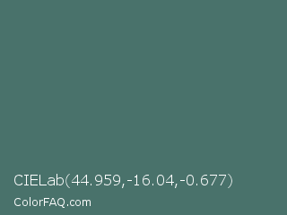 CIELab 44.959,-16.04,-0.677 Color is a normal cyan color and the nearest color is Hookers Green #49796b. Hex code #49726b and RGB value is rgb(73,114,107). In RGB color space, this color is composed of 29% red, 45% green, 42% blue, In CMYK color space, this color is composed of 36% cyan, 0% magenta, 6% yellow , 55% black , In HSL color space, this color has a hue angle of 170° , 22% saturation and 37% lightness.