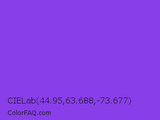 CIELab 44.95,63.688,-73.677 Color is a normal violet color and the nearest color is Blue Violet #8a2be2. Hex code #883ee8 and RGB value is rgb(136,62,232). In RGB color space, this color is composed of 53% red, 24% green, 91% blue, In CMYK color space, this color is composed of 41% cyan, 73% magenta, 0% yellow , 9% black , In HSL color space, this color has a hue angle of 266° , 79% saturation and 58% lightness.